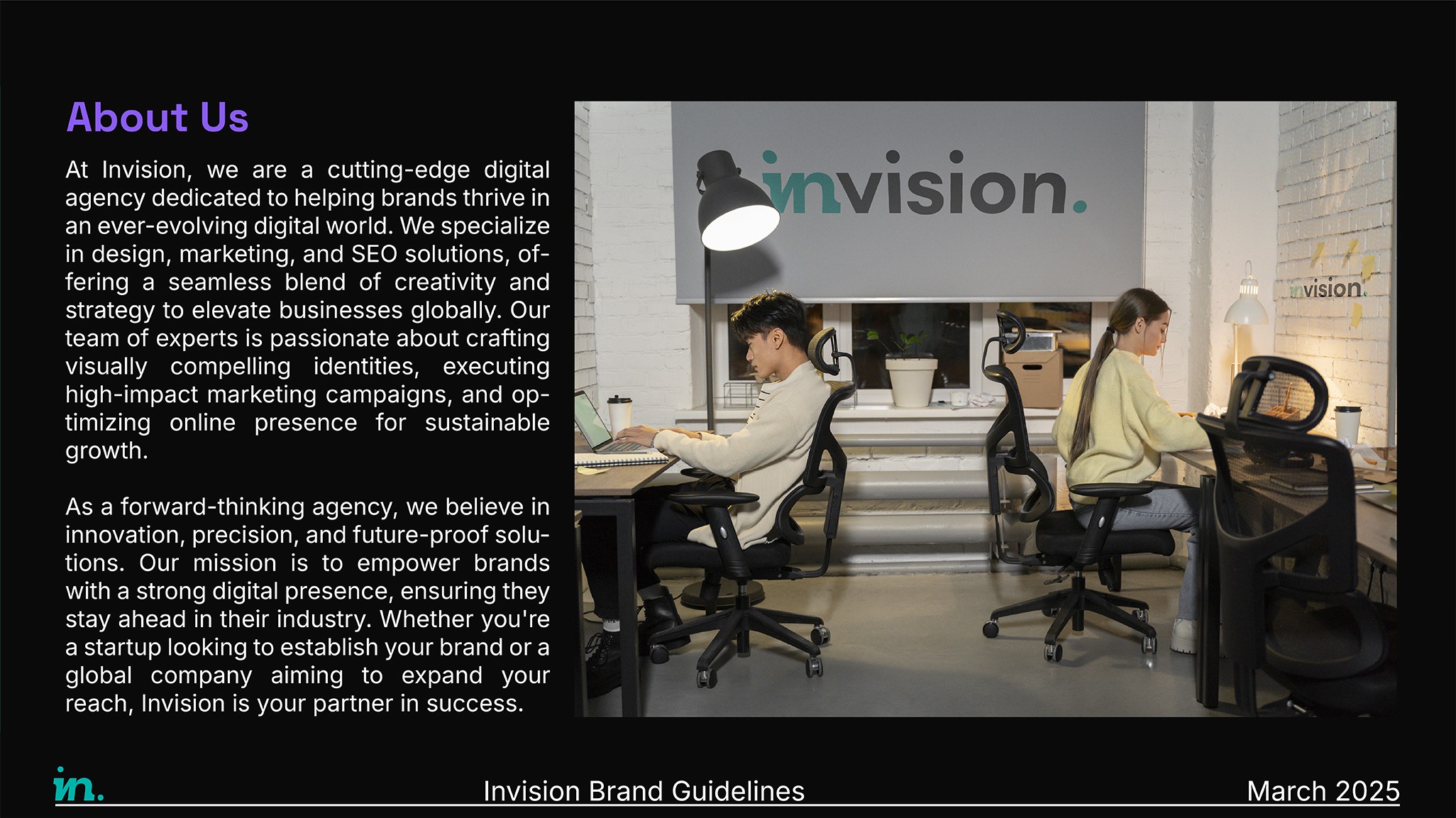 At Invision, we are a cutting-edge digital agency dedicated to helping brands thrive in an ever-evolving digital world. We specialize in design, marketing, and SEO solutions, offering a seamless blend of creativity and strategy to elevate businesses globally. Our team of experts is passionate about crafting visually compelling identities, executing high-impact marketing campaigns, and optimizing online presence for sustainable growth.